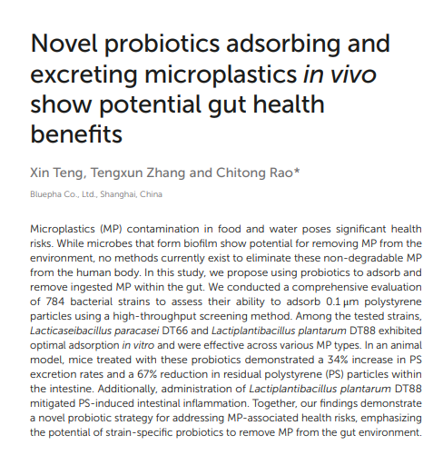 Teng X, Zhang T, Rao C. Novel probiotics adsorbing and excreting microplastics in vivo show potential gut health benefits. Front Microbiol. 2025 Jan 10;15:1522794. doi: 10.3389/fmicb.2024.1522794. PMID: 39867494; PMCID: PMC11757873.